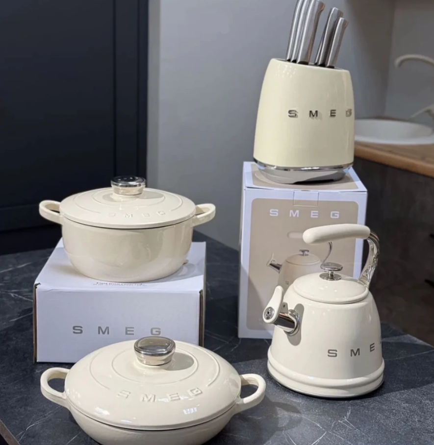 Cream Smeg Whistling Kettle + Knife Set + Cream Pot